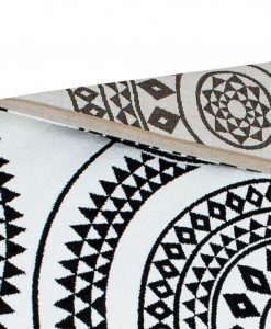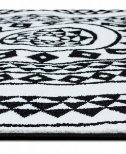 Black & White Circle är maskinvävd i polypropylen och har ett dekorativt cirkelmönster. Mattan har en vit bottenfärg som ramas in med svart langettering på långsidorna.