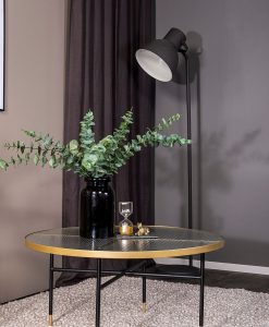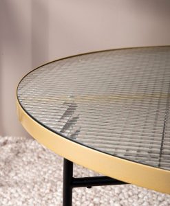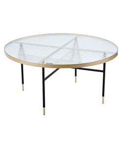 Ett bord med lyxig känsla! Svarta metallben tillsammans med en rund glasskiva som omges av mässing, och mässingen syns även från bordets ovansida. Diameter: Ø98 cm Höjd: 48 cm Kräver enklare montering.