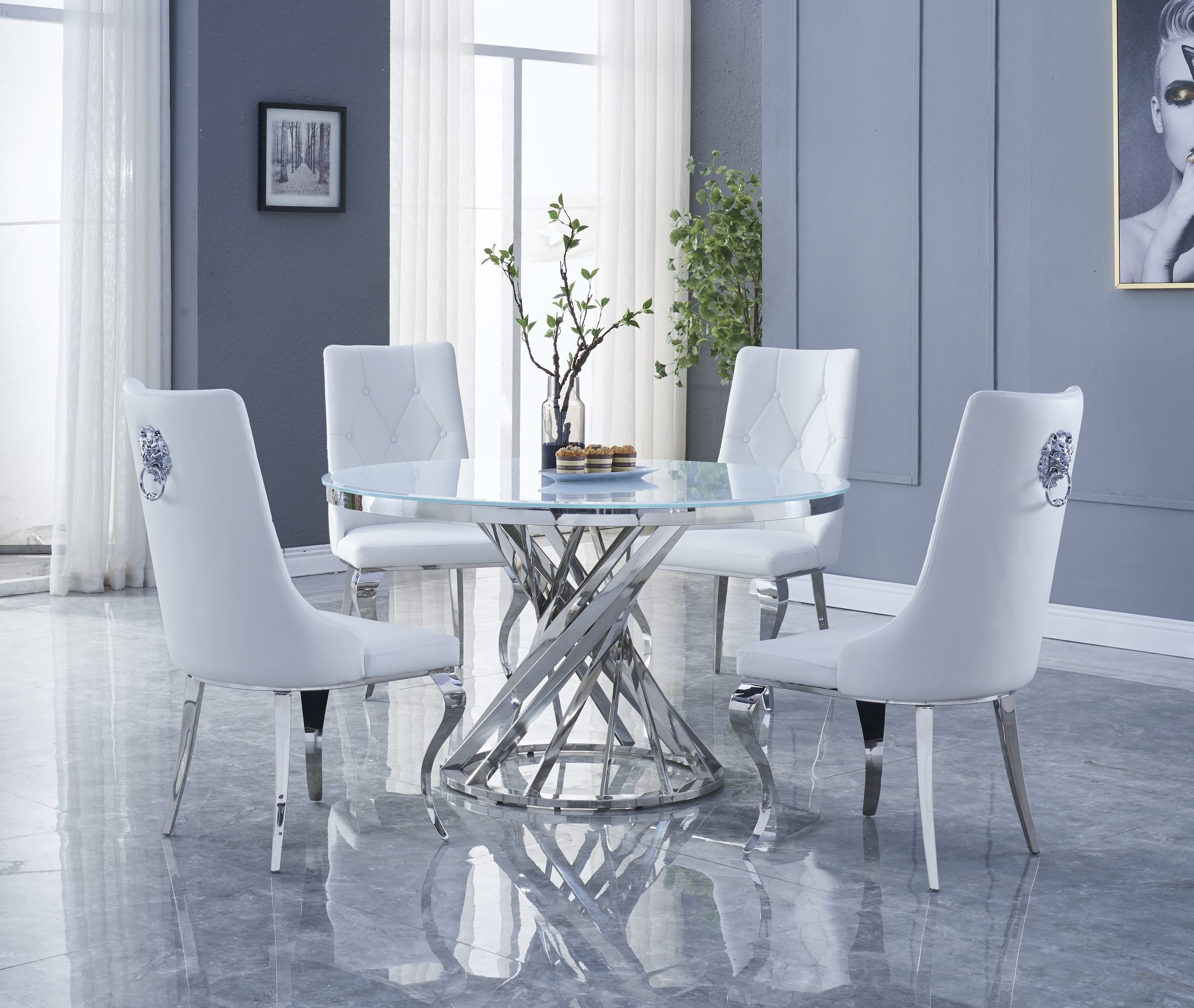 Ett mysigt matbord med en modern design i silvermetall. Med skiva av Marmor. Bordsskivan är tillverkad av marmor och underredet är av silverpolerad metall. Ett verkligt fynd.