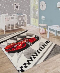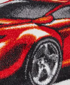 Car har ett rutmönster i färgerna vitt och svart med fräckt motiv av röda sportbil. Mattan har en kort skuren lugg och är maskinvävd i polypropylen vilket är ett syntetmaterial som är lätt att rengöra och hålla fri ifrån ludd och damm. Eftersom den har korta fibrer så tränger inte smuts in lika lätt som på en matta med längre fibrer och den är även resistent mot de flesta fläckar. Mattan är gjord i carvingteknik, vilket innebär att den är gjord med utskärningar för att på så sätt få färger och detaljer mer framträdande och ge en större effekt.