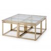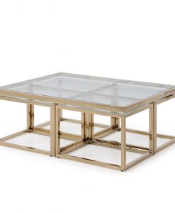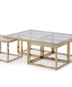 Carmen by J-P.Design är en exklusiv möbelkollektion som står ut från mängden. Ett otroligt elegant och snyggt soffbord i guld med toppskiva i glas. Soffbordet har fyra mindre under glasplattan.