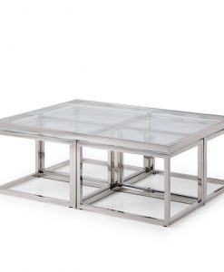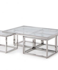 Carmen by J-P.Design är en exklusiv möbelkollektion som står ut från mängden. Ett otroligt elegant och snyggt soffbord i krom med toppskiva i glas. Soffbordet har fyra mindre under glasplattan.