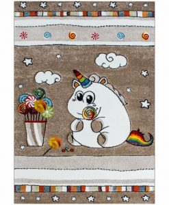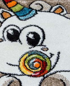 Caruba Unicorn är en frisématta som har sandfärgad botten med matchande langettering på långsidorna. Mattan har mönster av vita små moln och en söt, liten enhörning som har färgglad svans och horn. Mattan är gjord i carvingteknik, vilket innebär att den har utskärningar för att färger och detaljer skall bli mer framträdande och ge större effekt.
