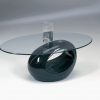 Deggy är ett modernt och stilrent ovalt soffbord med en topp i härdat glas och vitlackat underrede