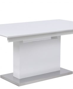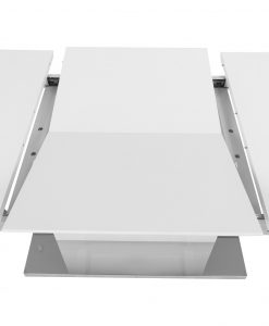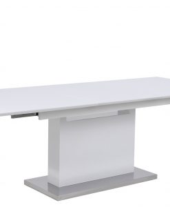 Högblankt lackerat modernt matbord med en smart iläggsskiva som man enkelt gömmer i bordet när man inte har den i. Det sitter små dolda hjul under benparet på matbordet så att man enkelt kan dra ut det när det är dags att lägga i iläggsskivan. Matbordet är i vitlackad
