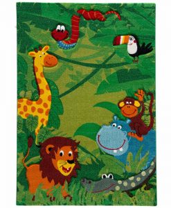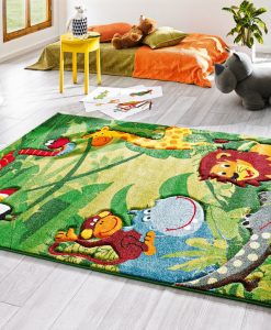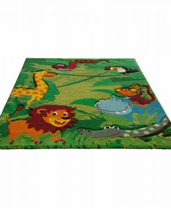 Djungel är en maskinvävd barnmatta i syntetmaterial vilket gör att den är luddfri och enkel att dammsuga och hålla ren. Den korta skurna luggen gör den till ett bra underlag att leka på.