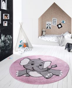 Dumbo Rosa barnmatta är en maskinvävd matta som har rosa bottenfärg och matchande langettering. Mattan pryds av en grå elefant som hoppar och busar. Mattan är vävd med effektgarn som reflekterar ljuset och ger en skimrande effekt, beroende på hur ljuset faller.