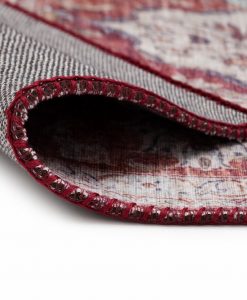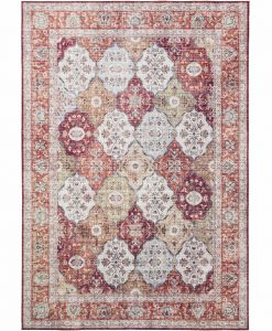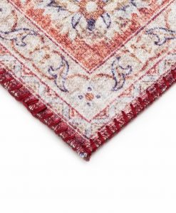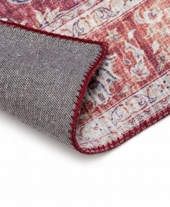 Edelmira är en elegant matta som har vackert mönster med orientalisk inspiration. Mattan har en melerad roströd bottenfärg med tryckt mönster i röda och blå toner. Mattans kanter pryds utav en sydd langettering som består av riktiga stygn i röd ton, vilket ger en exklusiv och lyxig känsla.