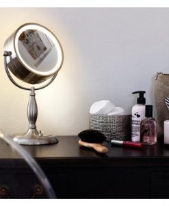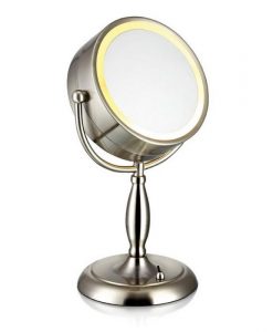 Markslöjd Face rak- sminkspegel med belysning. Förstoringsspegel (3x) på ena sidan och vanlig spegel på den andra. Liten (E14) lamphållare för lågenergilampa max 7W. Strömbrytare på bordsplattan.