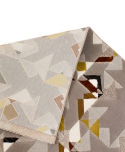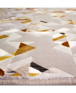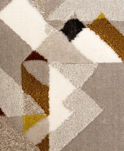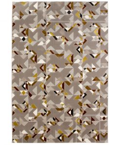 Flen Multi har en kort skuren lugg och är maskinvävd i polypropylen. Mattan har en grå-beige bottenfärg med matchande langettering. Mattan pryds av kuber i grafiska former där färgerna går i senapsgult, rostrött och vitt.