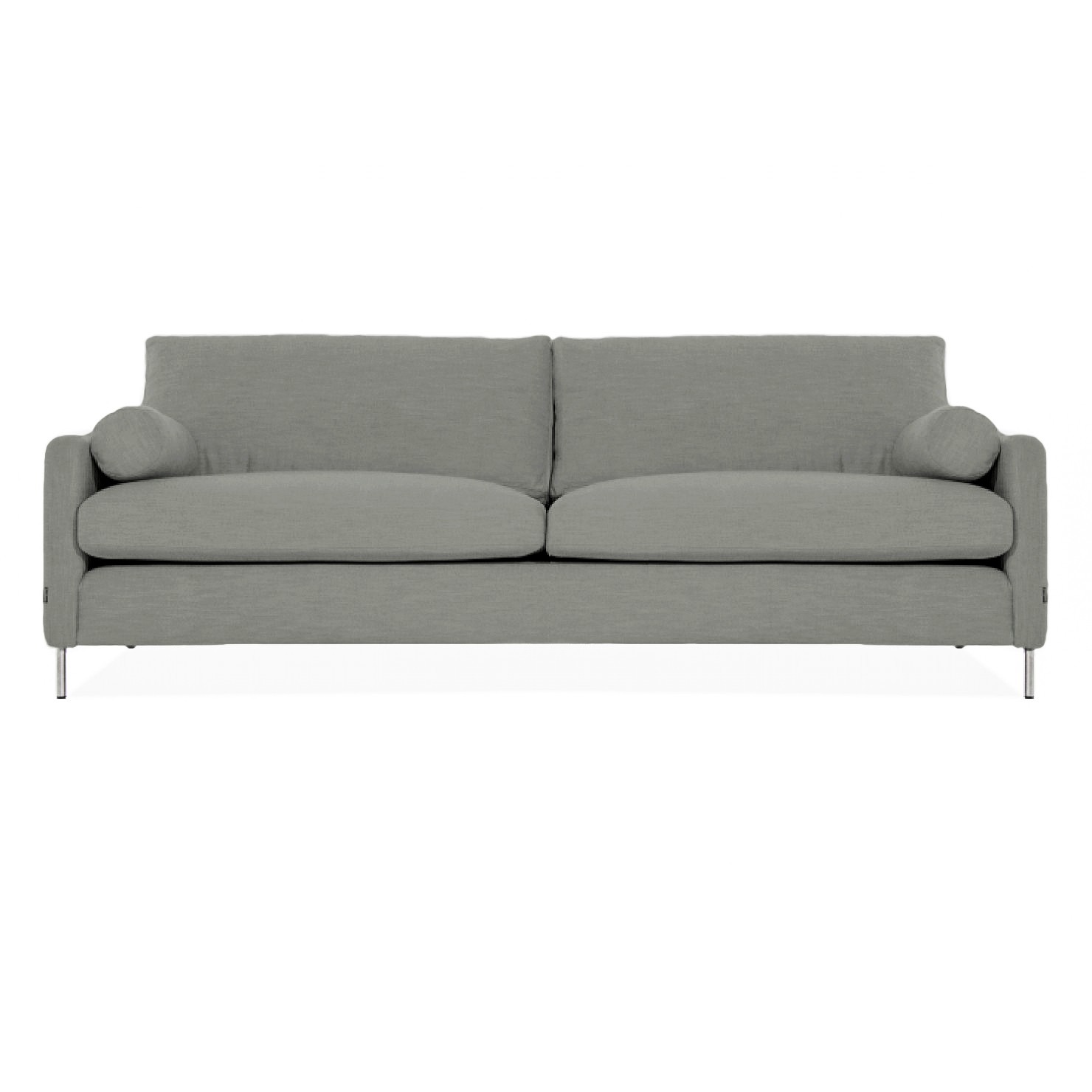 Två runda prydnadskuddar i matchande tyg medföljer och ger soffan ett extra stilfullt utseende och de 12cm höga metallbenen gör det lätt att städa under soffan.