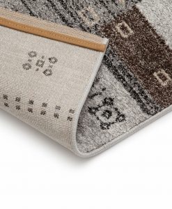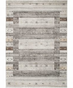Gabè är en frizematta som har en ljusgrå bas med en matchande langettsöm som löper runt längs långsidorna. Mattan har ett Gabè mönster & är vävd i flera diskreta basfärger såsom Natur, Grått, brunt & svart.
