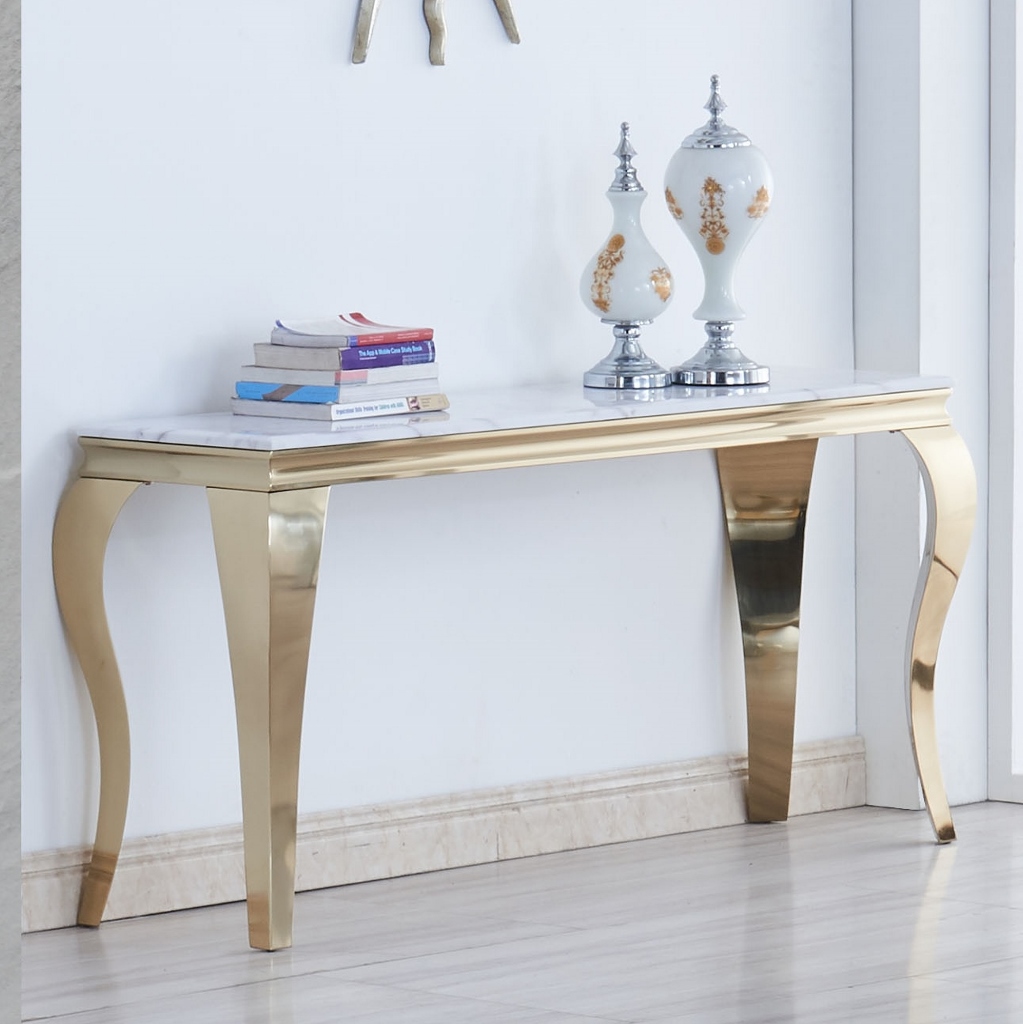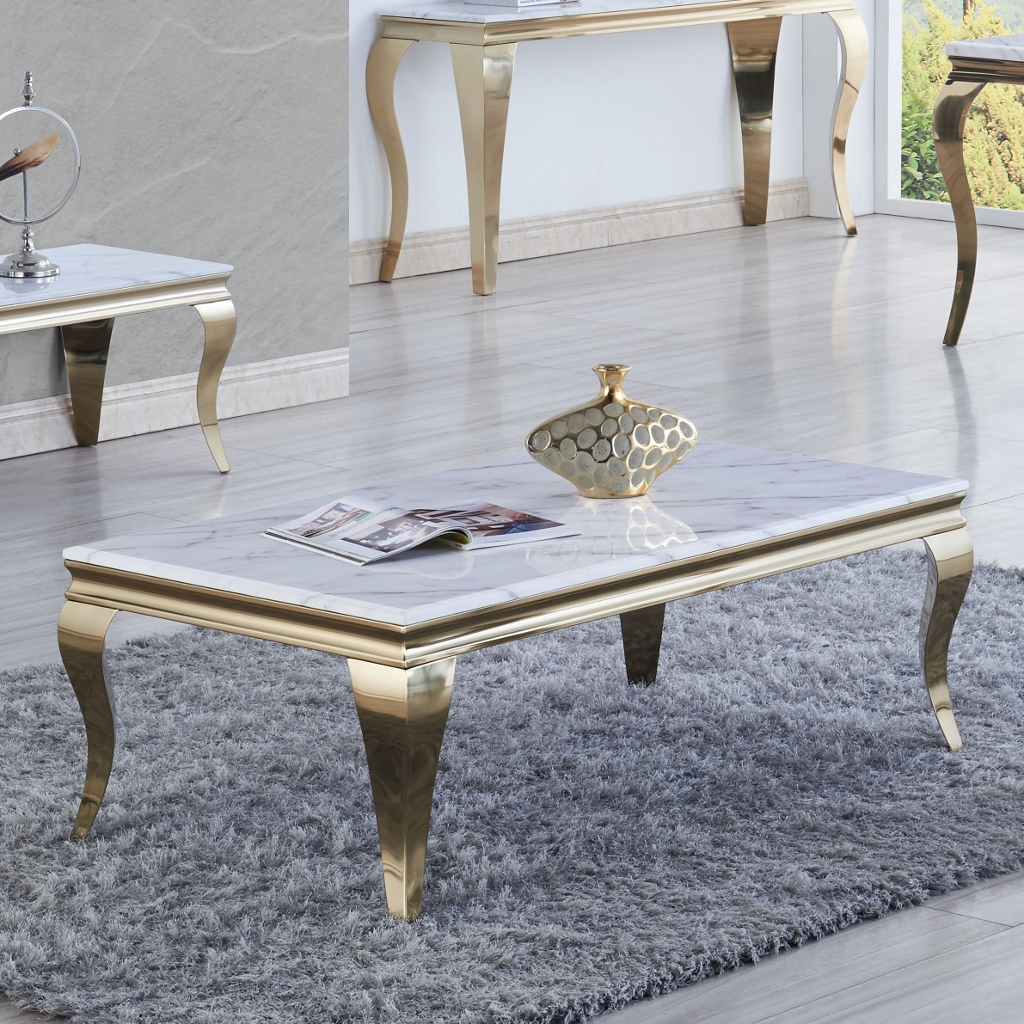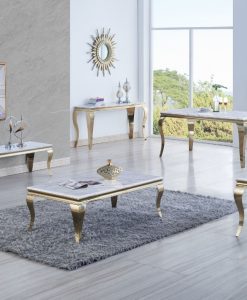 Gold är en modern tvbänk som är i victoriansk stil, skivan är i ljus marmor. Finns att beställa hörnbord, matbord & soffbord från samma serie.