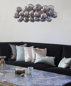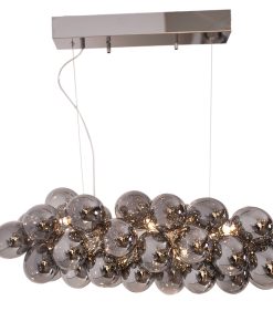 Ståtlig takpendel med en känsla av lyx från svenska varumärket By Rydéns, bestående av 38 st skira glas i kluster. Längd: 80 cm. 8 st G9 lampor, (ej inkluderade). Passar utmärkt hängandes över matsalsbordet, eller över konferensbordet.