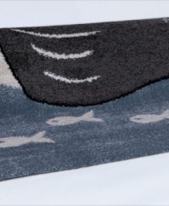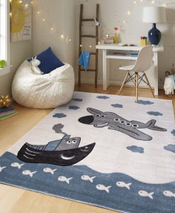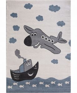 Happy Airplaine barnmatta är en maskinvävd matta som har vit bottenfärg och blå langettering. Mattan pryds av en liten båt och små fiskar som simmar i vattnet. Mattan är vävd med effektgarn som reflekterar ljuset och ger en skimrande effekt, beroende på hur ljuset faller.