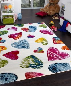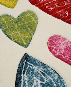 Hjärtor har en cremevit bottenfärg med matchande langettsöm som löper längs långsidorna. Den har mönster med hjärtan i olika storlekar och färger såsom grön, grå, blå, rosa och gul. Hjärtor har en kort skuren lugg och är maskinvävd i polypropylen, vilket är ett syntetmaterial som är lätt att rengöra och hålla fri ifrån ludd och damm. Eftersom den har korta fibrer så tränger inte smuts in lika lätt som på en matta med längre fibrer och den är även resistent mot de flesta fläckar.