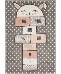 Hoppa Hage barnmatta är en stilren barnmatta som kommer i mjuka pastelltoner. Mattan har en grå botten med vita små prickar och pryds utav en söt kanin vars nos, öron och kinder är puderrosa.