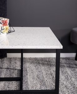 Terazzo är ett otroligt tåligt och vackert material som även kan kallas cementmosaik, där vackra stenar gjuts sammans. Varje skiva blir unik i sitt utseende. Detta bord har ett designat svartlackerat metallunderrede.