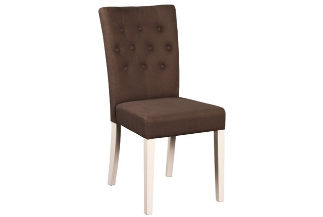 Stol med vita ben i trä och grå tygklädsel med dekorativa knappar i ryggen. Riktigt snygg och bekvämt stol. Passar till många av våra matbord.