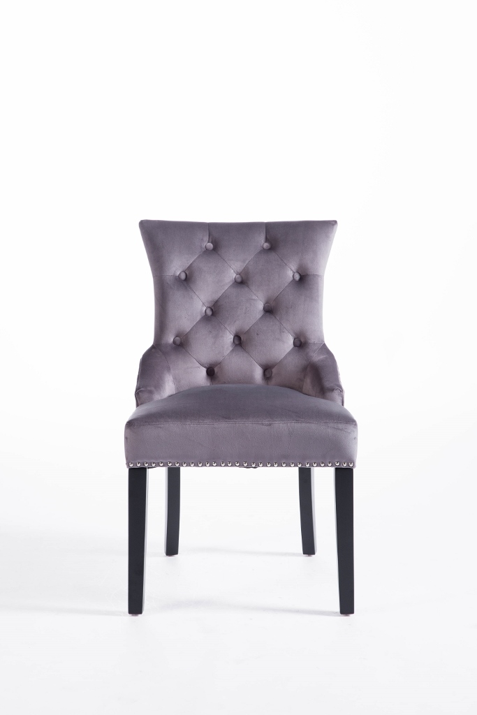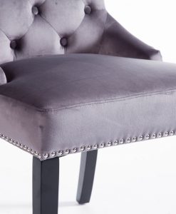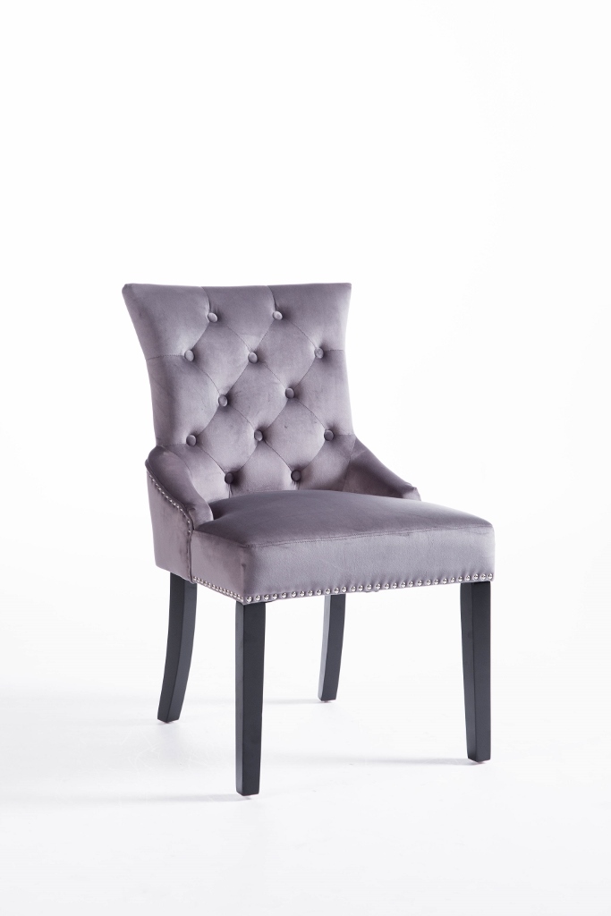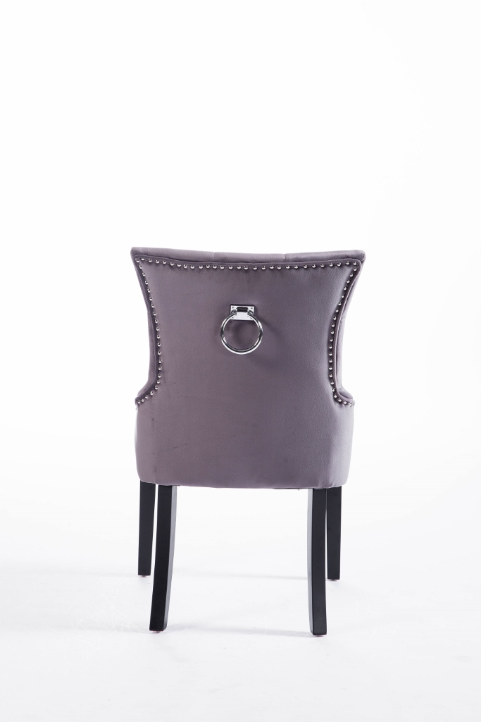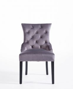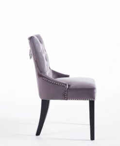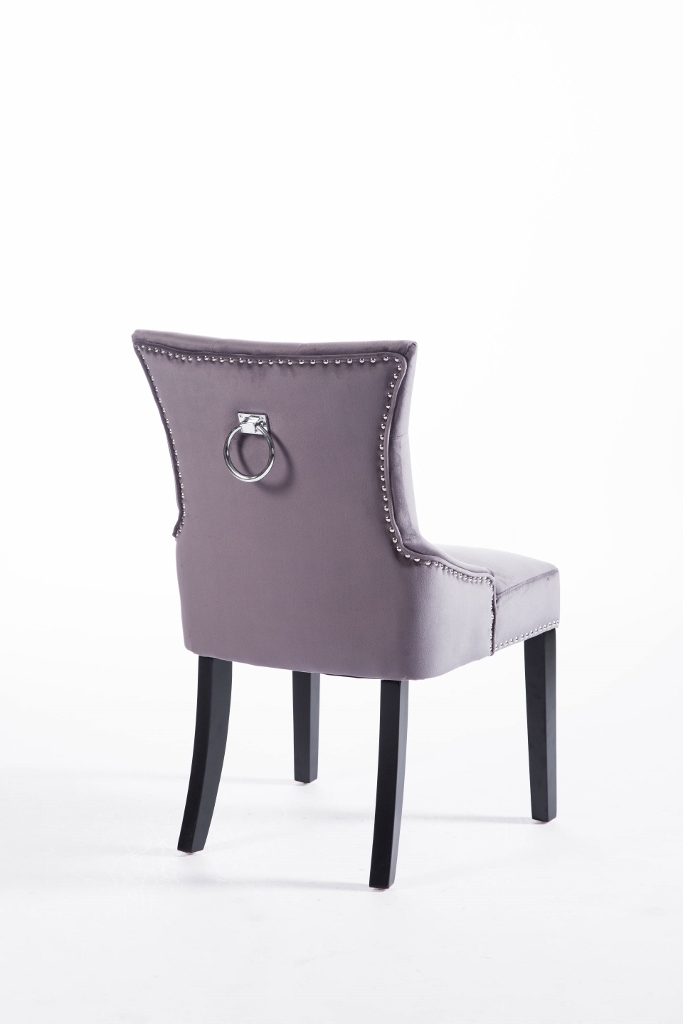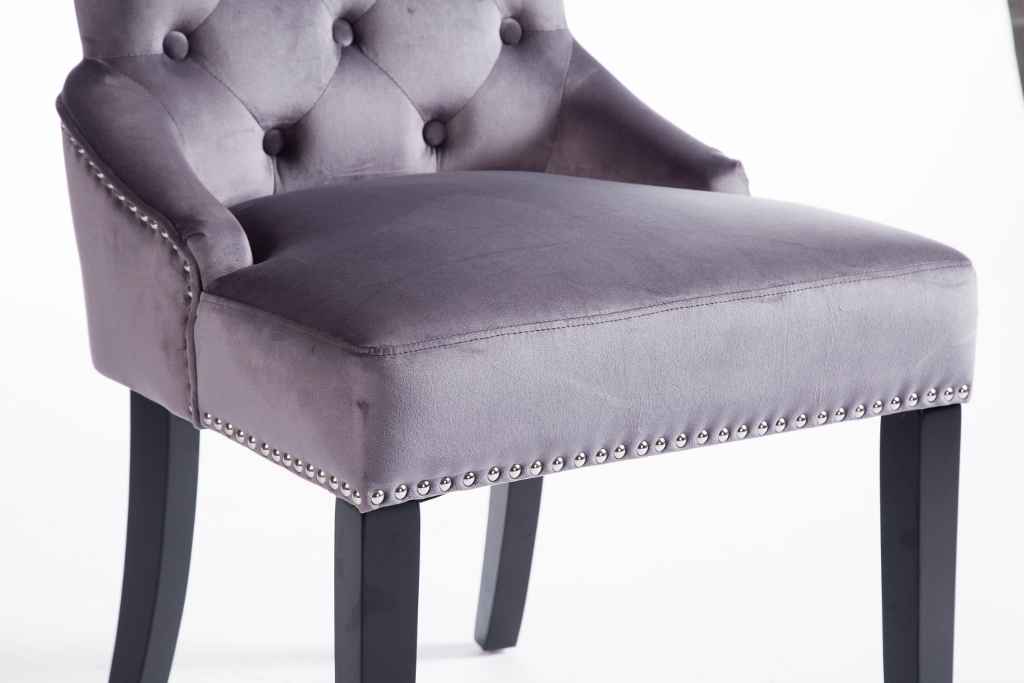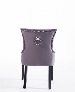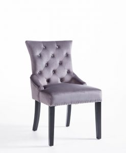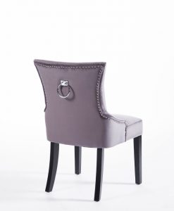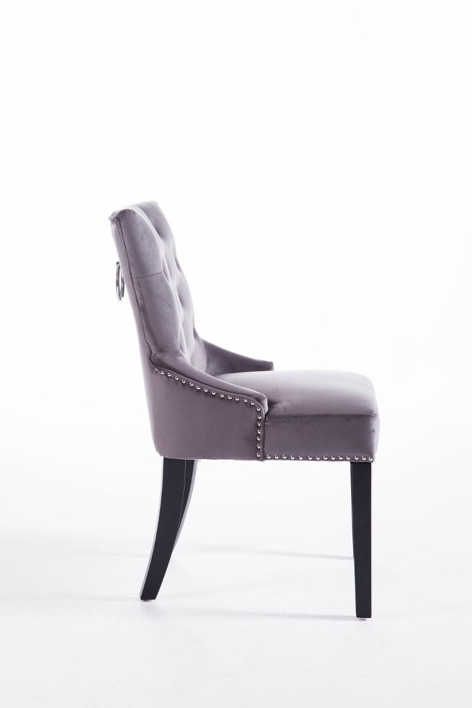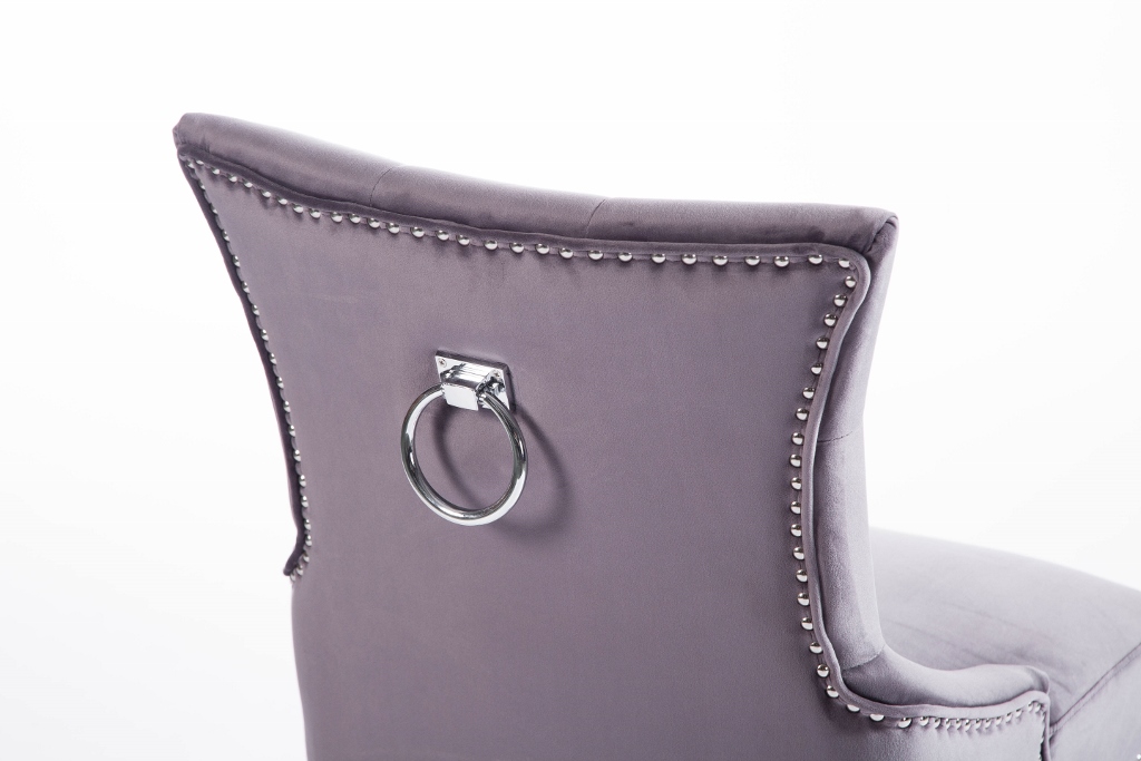 Denna matrumsstol lämnar du inte i första taget! Klädd med slitstark sammet och med dekor nitad runtom. På ryggen sitter en stor silverring. Finns även matchande barstolar.