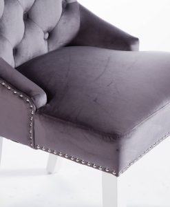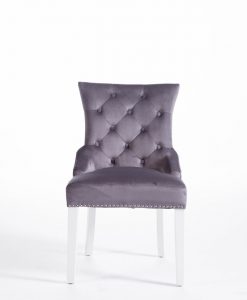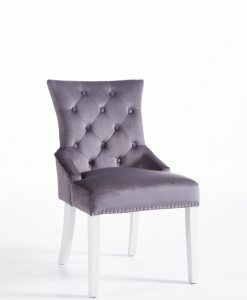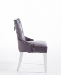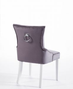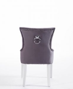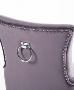 Denna matrumsstol lämnar du inte i första taget! Klädd med slitstark sammet och med dekor nitad runtom. På ryggen sitter en stor silverring. Finns även matchande barstolar.