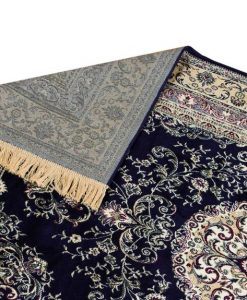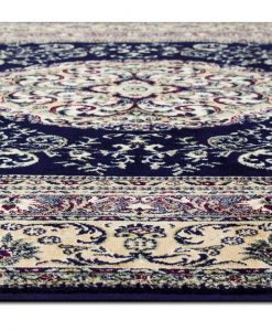 Kashmir har en blå bottenfärg med matchande langettering och cremevita fransar på kortändarna. Mattan har ett klassiskt orientaliskt mönster som går i vita, gula och röda toner.