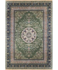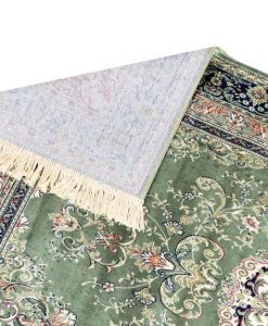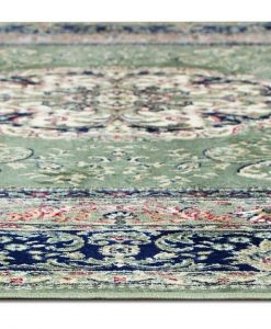 Kashmir har en grön bottenfärg med matchande langettering och cremevita fransar på kortändarna. Mattan har ett klassiskt orientaliskt mönster som går i vita, röda, gula och blå toner.