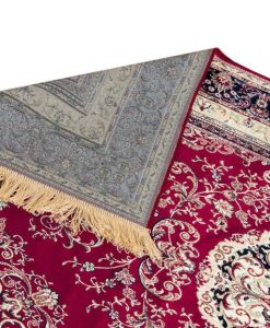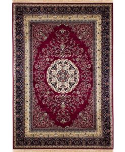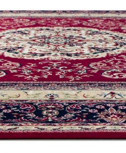 Kashmir har en röd bottenfärg med matchande langettering och cremevita fransar på kortändarna. Mattan har ett klassiskt orientaliskt mönster som går i vita, röda, gula och dovt gröna toner.