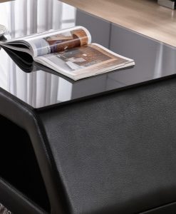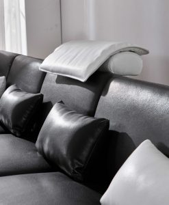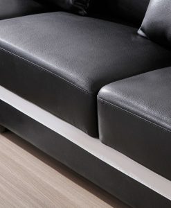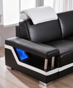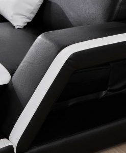 Denna snygga designsoffa kommer med en liten hylla vid sidan och en lampa som omvandlar vardagsrummet till ett mysigt ställe. Soffan är väldigt bekväm och har en komfortabel sittkänsla med flera nackstöd och kuddar. Finns även att köpa soffbord samt tvbänk, se under gruppval. Ni kan även välja soffan i tyg, ring kundtjänst så hjälper vi er.