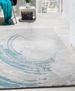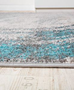 Kos Turkos har en vit-grå bottenfärg med grå langettsöm som löper längs långsidorna. Mattan har turkosa färgpartier som ger en fin effekt i cirkelmönstret.