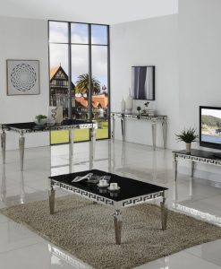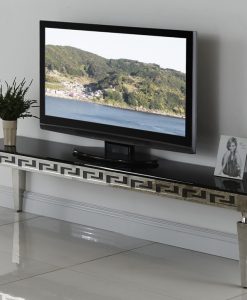 Stilrent designat tvbänk i silverpolerad metall med meanderbård. Svart härdad glasskiva. 1700-tal möter 2000-tal. Komplettera med matbord, konsol, matbord, soffbord och sidobord.
