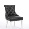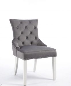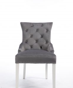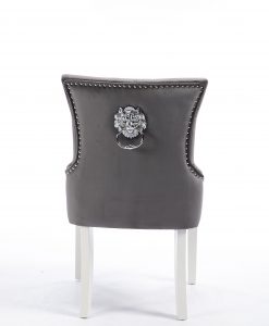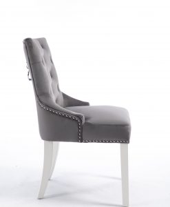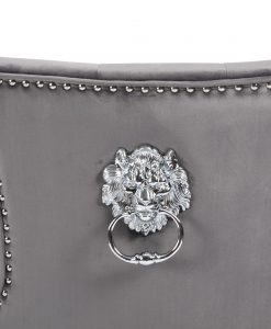 Stol i snyggt sammet med dekorspik och handtag i form av lejon ornament samt vita ben. Snygga klädda knappar på stolsryggens framsida ger stolen dess karaktär