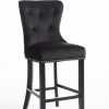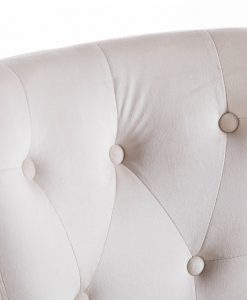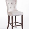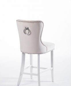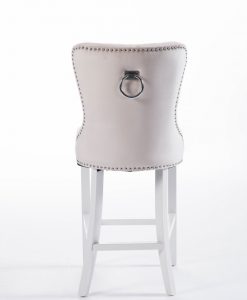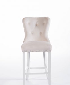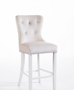 Otroligt prisvärd med lätt svängd rygg gör att du vill sitta länge i denna trevliga barstolen. Barstolen är klädd i ett beige slitstarkt sammets tyg med knapphäftad framsida. På ryggen sitter en stor silverring, benställning och fotstöd i massiv trä målad i en matchande färg. Finns även matchande matstolar.