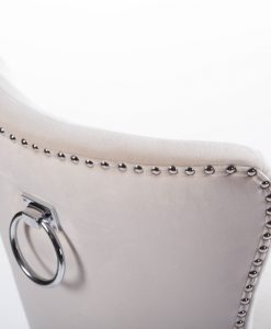 Hög matrums stol med lätt svängd rygg gör att du vill sitta länge i denna trevliga stol. Stolen är klädd i ett beige slitstarkt sammets tyg med knapphäftad framsida. På ryggen sitter en stor silverring och står på vita ben. Finns även matchande barstolar.