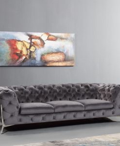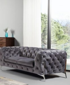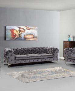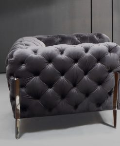 Lorenzo är spektakulära handgjorda soffgrupp i Chesterfield-liknade med handsydda knappar och exklusivt sammets tyg. Dess mjuka, böjda former gör det både inbjudande och fantastiskt att sitta på. Chesterfieldtyp klädd med grå sammet och benställning av silvermetall.