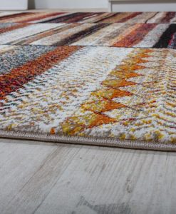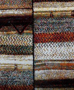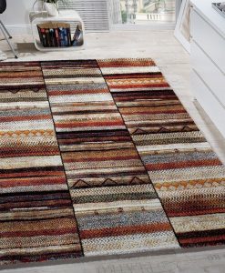 Mali Indio Dark har ett randigt mönster som går i olika toner av vit, orange, svart och inslag utav rött. Mali har en kort skuren lugg och är sydd med en langettsöm i ljusbeige. Mattan är maskinvävd i polypropylen, vilket är ett syntetmaterial som är lätt att rengöra och hålla fri ifrån ludd och damm.
