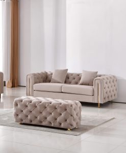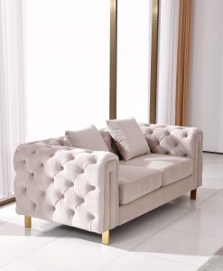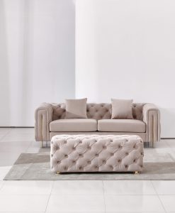 Lyxig och rejäl soffgrupp i grå sammet med mjuka, raka former och eleganta detaljer. Benen är gjorda utav rostfri metall i guld .Soffgruppen är stor och rymlig och ger ett elegant och lyxigt intryck med sitt detaljerade utseende.I priset ingår även dekorations-kuddar
