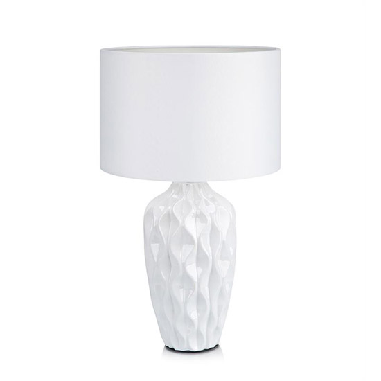 Angela är en fin bordslampa från Markslöjd i vit mönstrad keramik. Vit textilskärm med skärmring och 1,5m textilsladd med strömbrytare på sladden. Stor lamphållare (E27). Max 60W glödlampa eller motsvarande styrka i halogen, lågenergi eller LED. Finns även i vitt.