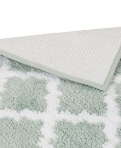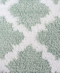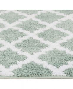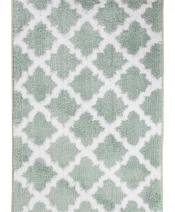 Maroccan badrumsmatta har en grön bottenfärg med ett stilrent och trendigt marockanskinspirerat mönster i vitt. Den har en tät, lång lugg som gör den mjuk att stå på och undersidan utav mattan är gummerad, vilket gör att den ligger stadigt på golvet. Maroccan badrumsmatta är gjord i materialet microfiber som har bra förmåga att lösgöra smuts och absorbera vätska, vilket gör den snabbtorkande. Eftersom microfiber har lång livslängd gör det Maroccan badrumsmatta till en hållbar och tålig matta.
