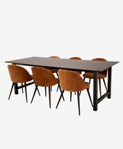 Stor matgrupp inkl. 6 stolar. Bordet består av en svartmålad MDF och ben av metall 100×220 cm, höjd 75 cm. Stolen är klädd i ett trevligt sammetstyg. höjd 77 cm, bredd 49,5 cm och djup 54,5 cm. Sitthöjd 47 cm och sittdjup 43 cm. Montera själv.