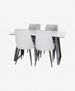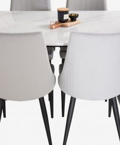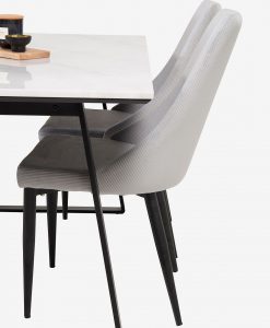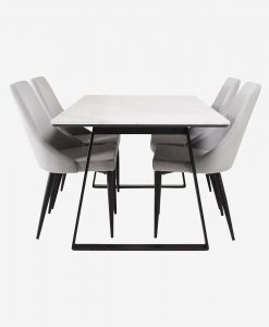 Sanna matgrupp, ett modernt matbord med exklusiva materialval. Bords topp av äkta marmor och stativ i metall. Bordets mått: 90 x 140, höjd 75cm. Matchas med 4 st moderna och bekväma matstolar i manchestertyg med metall ben. Mått stol: höjd 90, djup 63, bredd 46 cm. Sitthöjd: 48, sittbredd 41, sitt djup 43,5 cm. Bordet och stolarna kräver enklare montering.
