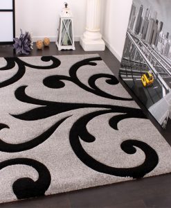 Studio line är en maskinvävd wiltonmatta med grå botten och ett snirkligt romantiskt mönster i svart.