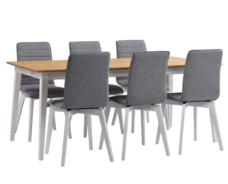Ett mycket snyggt och stilrent matbord i ek med en bordsskiva av massiv två cm fingerskarvad oljad ek med ben i vitlack. Här kombinerad med 4 eller 6 stycken stolar Mork i mattlackad ek och med klädsel i mörkgrått. Till bordet kan man köpa till en eller två stycken tilläggsskivor á 50 cm.