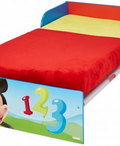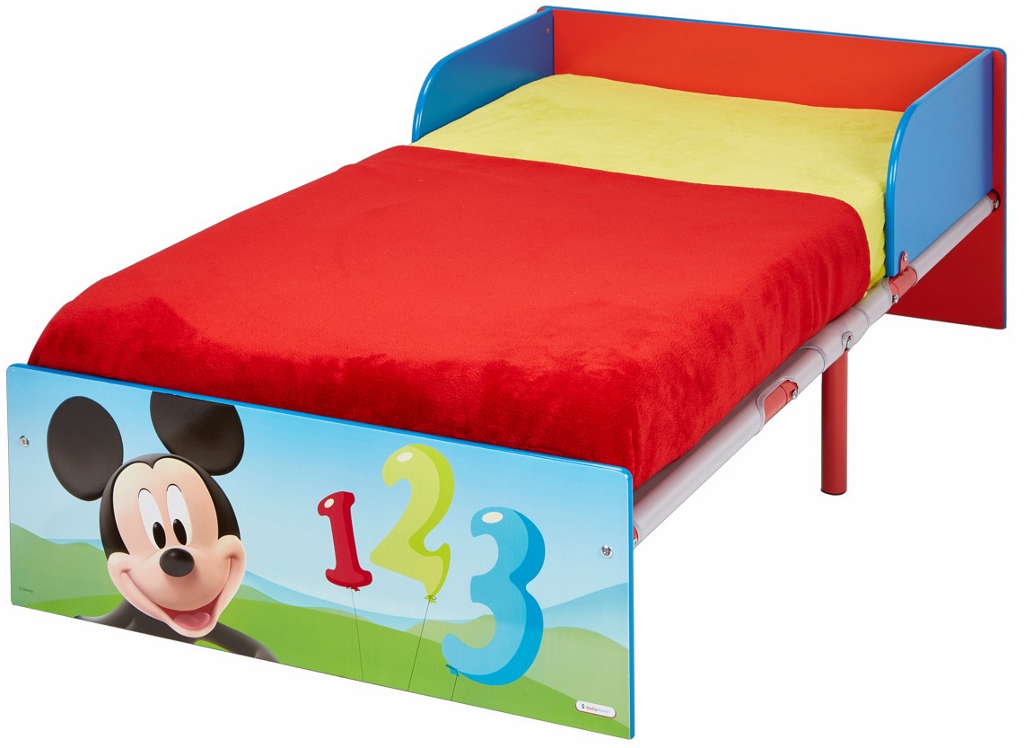 Fin barnsäng med Musse Pigg motiv. Sängen är tillverkad i lackerad MDF.
