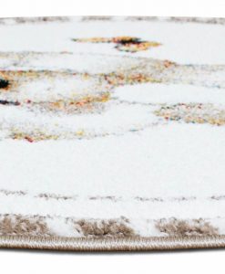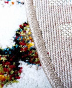 Nallebjörn har en beigefärgad bottenfärg och matchande langettering på långsidorna. Mattan har ett vitt rutmönster som pryds av en söt nallebjörn och små fjärilar i olika nyanser. Nallebjörn har en kort skuren lugg och är maskinvävd i polypropylen, vilket är ett syntetmaterial som är lätt att rengöra och hålla fri ifrån ludd och damm.