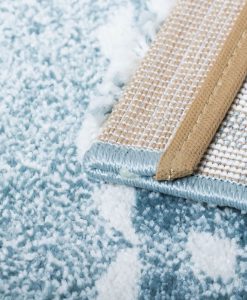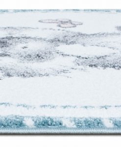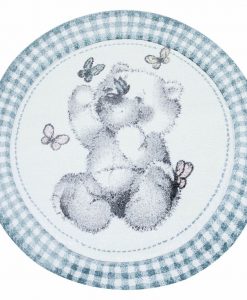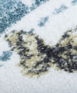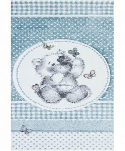 Nallebjörn har en turkos bottenfärg och matchande langettering på långsidorna. Mattan har ett vitt rutmönster som pryds av en söt nallebjörn och små fjärilar i olika nyanser. Nallebjörn har en kort skuren lugg och är maskinvävd i polypropylen, vilket är ett syntetmaterial som är lätt att rengöra och hålla fri ifrån ludd och damm.