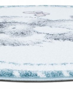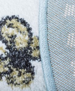 Nallebjörn har en turkos bottenfärg och matchande langettering på långsidorna. Mattan har ett vitt rutmönster som pryds av en söt nallebjörn och små fjärilar i olika nyanser. Nallebjörn har en kort skuren lugg och är maskinvävd i polypropylen, vilket är ett syntetmaterial som är lätt att rengöra och hålla fri ifrån ludd och damm.