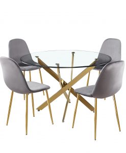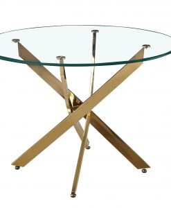 Penny matgrupp, ett stilrent bord med en bordsskivan är av klarglas och vinklade metall ben, som gör bordet robust och hållbart.