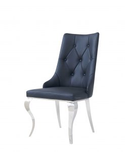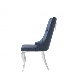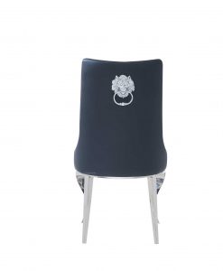 En härlig matrums stol i svart med ett lejonhuvud på ryggen ger denna matrums stol ett magnifikt intryck. Med nozag resår i sitsen får du en bra komfort, även under långa sittningar. Benställning med rokokoben i krom.