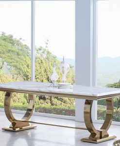 Exklusivt, prisvärt matbord i guldmetall. Med skiva av vit marmor massa. Ligger på benställning i silverpolerad metall i form av halvcirklar. Ser betydligt dyrare ut än det är. Ett verkligt fynd.